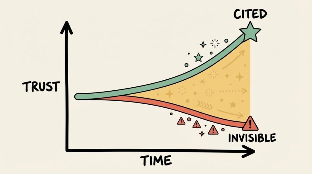 Machine learning systems compound advantages. Content that AI models learn to trust gets cited more. More citations produce more training data reinforcing that trust. The gap between cited brands and invisible brands widens with each model update.